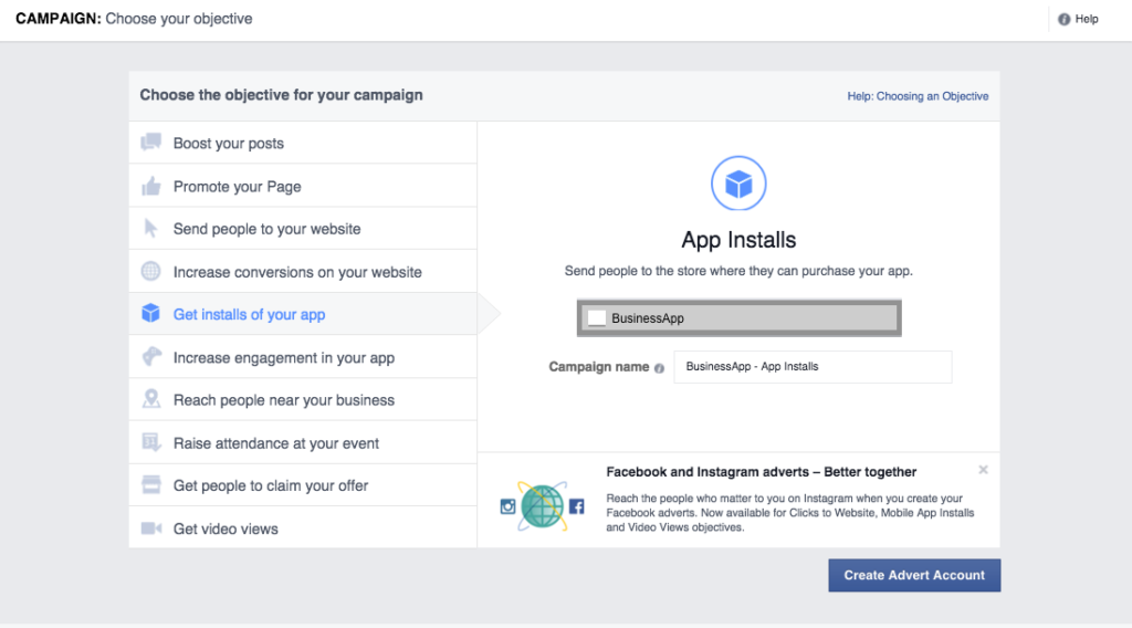 In other words, there are multiple campaign objectives you can choose from – app installs, traffic, and conversions.